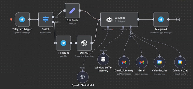- L’agente AI può trascrivere, capire l’intento e poi scegliere se mandare un’email, creare un evento, rispondere su Telegram, ecc.