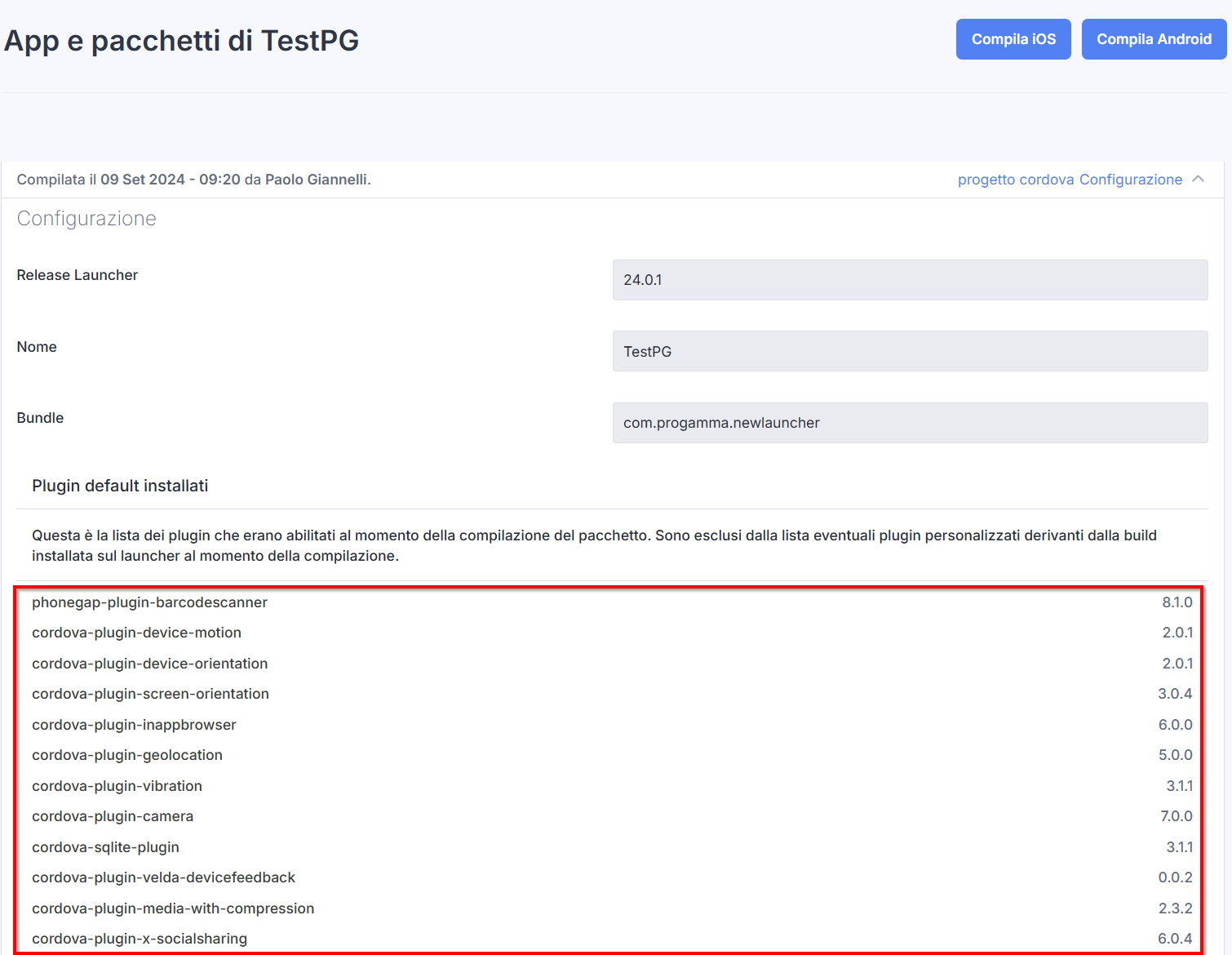 Vado nel mio Launcher e guardo nella sezione App e Pacchetti dove trovo la versione dell’applicazione installata e sotto la sezione Pacchetti che una volta espansa mi mostra la configurazione del progetto Cordova con la lista dei pacchetti abilitati per quella compilazione.