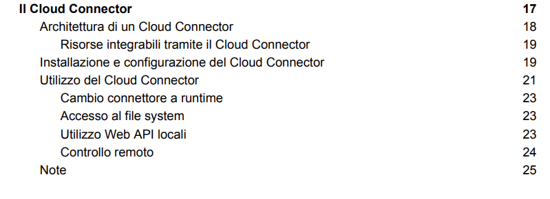 Ora il capitolo Il Cloud Connector contiene tutte le informazioni relative escluse quelle specifiche dell’installazione che trovate su github.com/progamma/cloud-connector