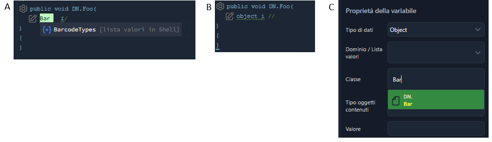 Come si può vedere nell’immagine A, se scrivo “Bar”, l’editor non trova la mia classe (DN.Bar).