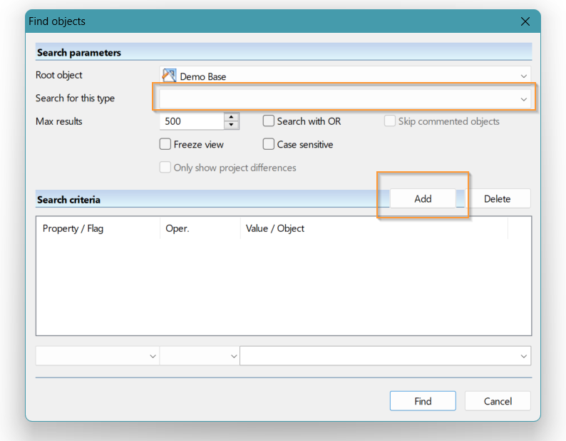 La ricerca può essere effettuata per tipo oggetto in modo da limitare i risultati ad un solo tipo e poi posso inserire dei criteri utilizzando il tasto Add per specificare come e cosa cercare.
