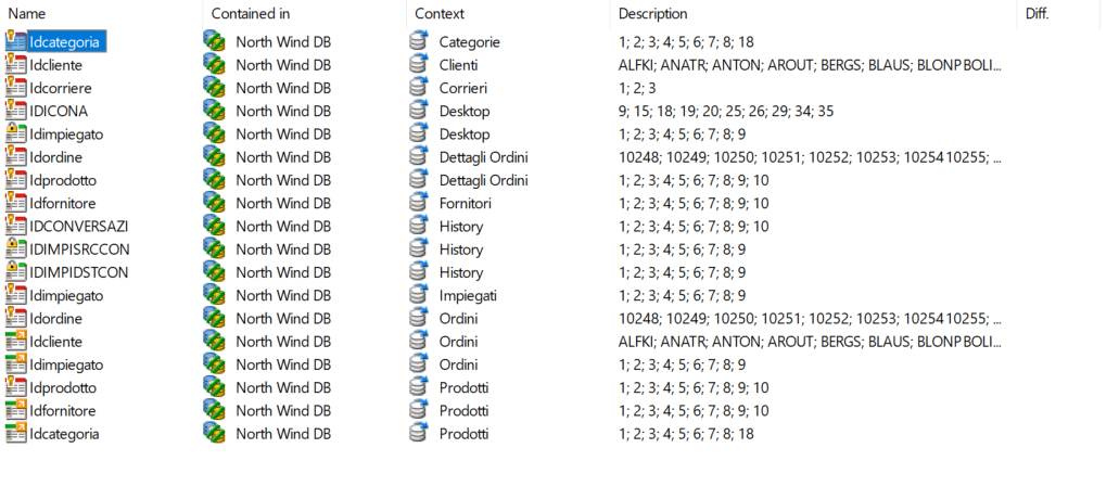 Per esempio nella ricerca dell’immagine sottostante sto cercando tutti i campi di tabelle che hanno nel loro nome la stringa id: